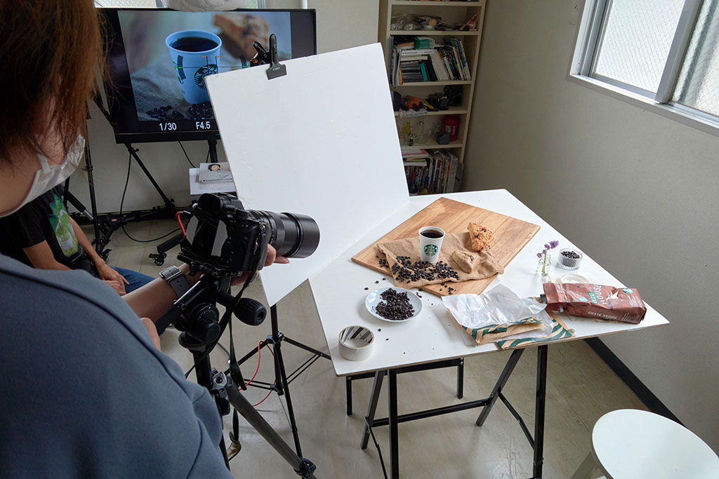 ライティングだけでなく構図や配置などもじっくり勉強するのが目的ですので、被写体は本物の料理ではなく撮影中に状態の変わらない食べ物(お菓子やケーキ、ハンバーガー等)を各自持ち込み。