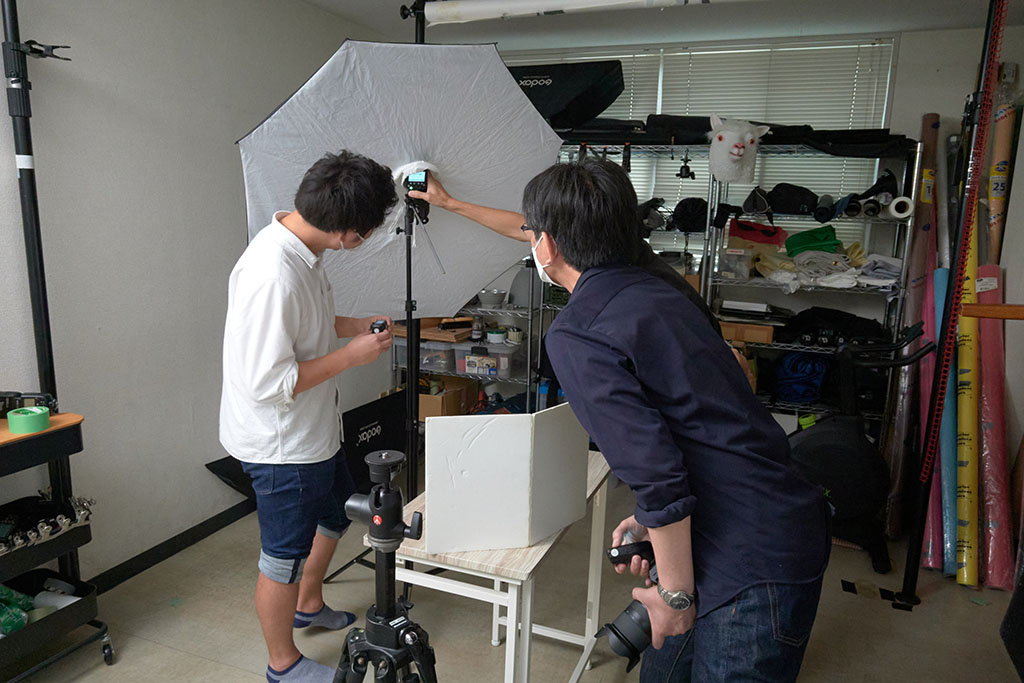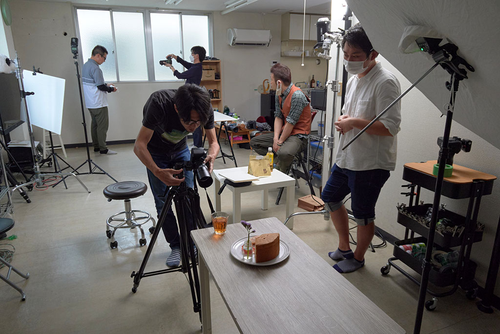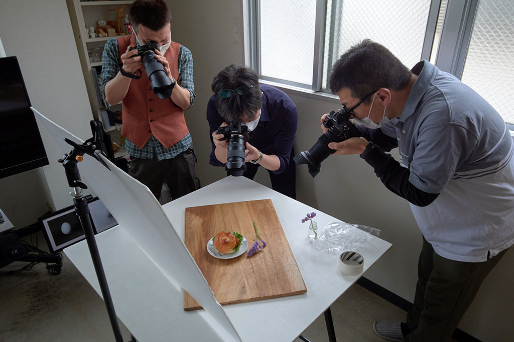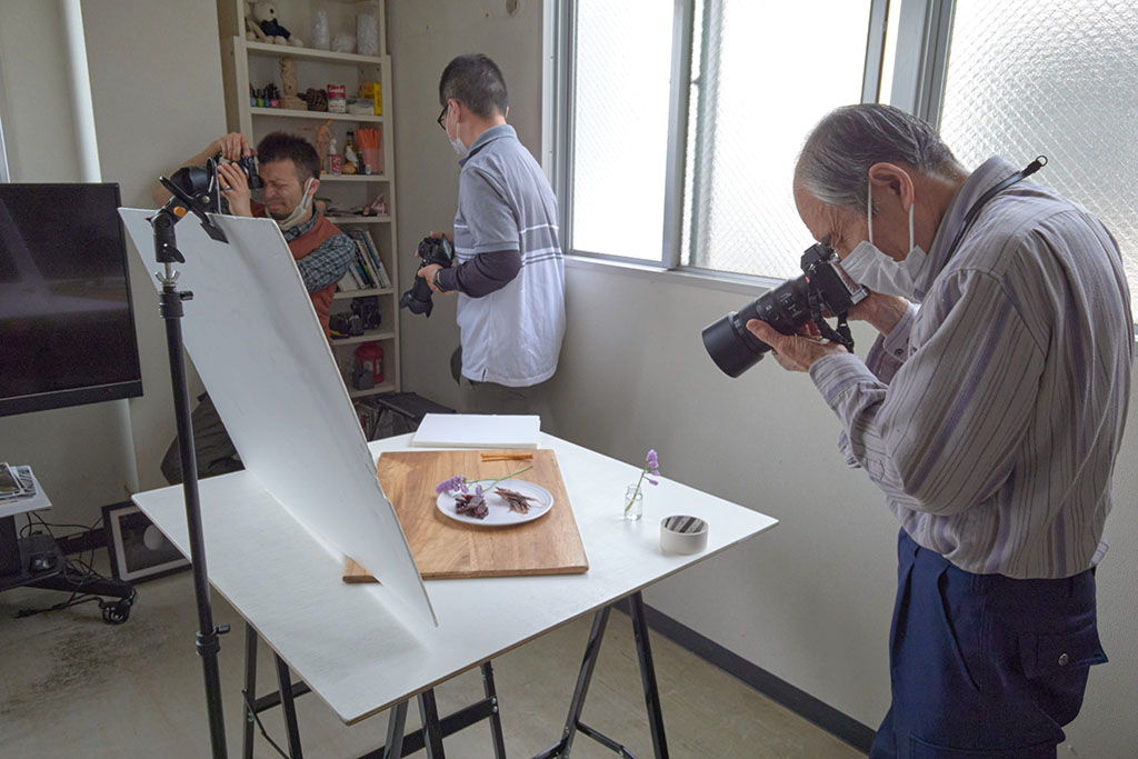 自然光やストロボ・定常光でのライティング、小物を添えたり皿を選んだりと思い思いに被写体を並べて撮影。どの勉強会でも同じですが基本的にやり方は自由です。撮影に伴う機材設置や使い方等も参加者同士で手伝ったり教え合うのもまた勉強。あーだこーだと意見を出し合って試していきます。