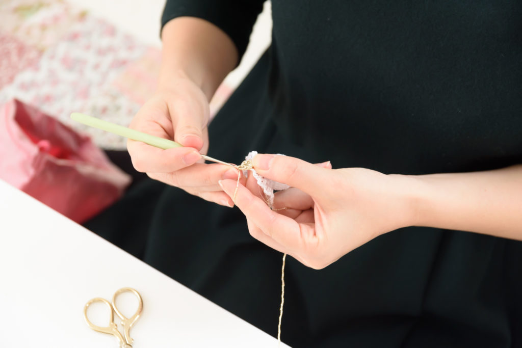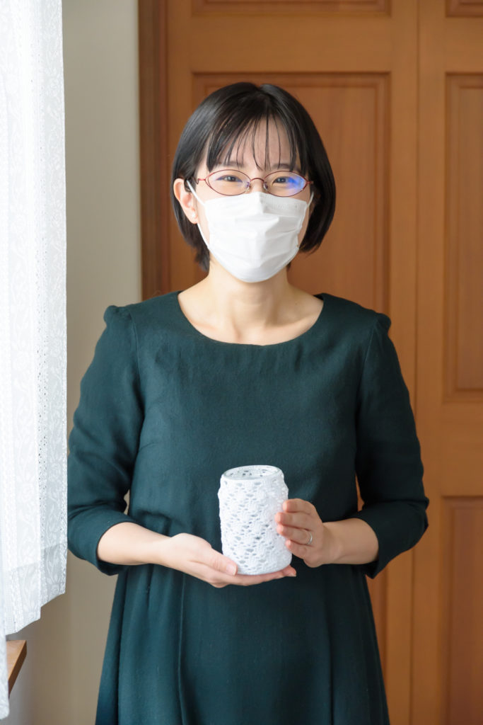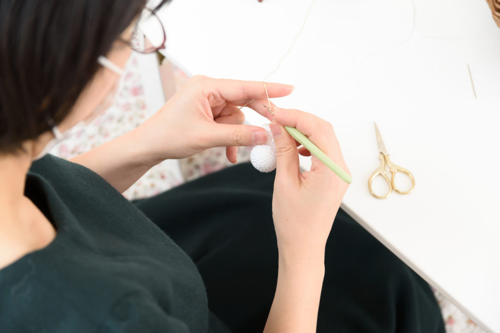 レース編み作家として活動する、つるさん。2020年からハンドメイド作品の販売サイトminneで「編み物工房 金の針」を出店している。